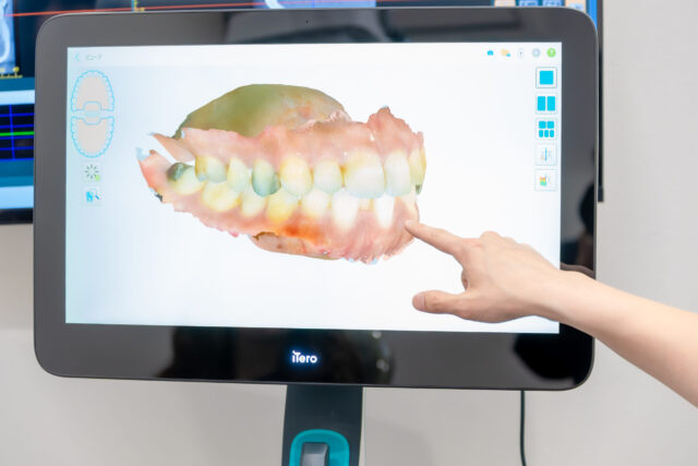 従来の矯正治療では、シリコンや粘土のような冷たい材料をお口いっぱいに詰め込み、数分間我慢して型取りをする必要がありました。嘔吐反射がある方にとっては非常に辛い時間だったと思います。